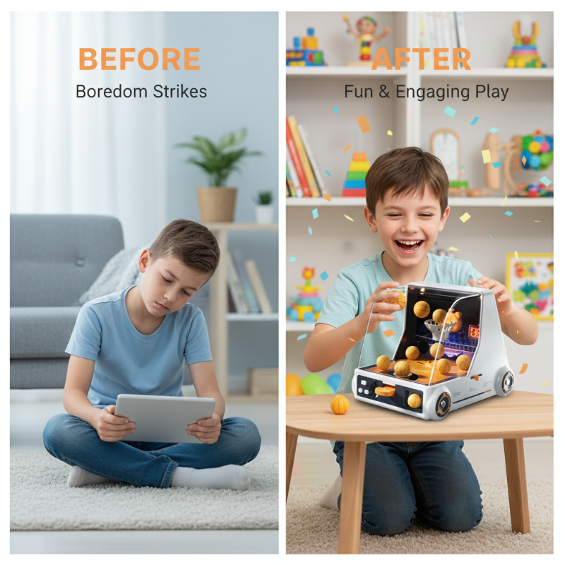 DINAMIKUS FÉNYEK ÉS HANGOK – Merüljön el a játékban izgalmas fények és háttérzene kíséretében. Az éljenző hanghatások minden sikeres lövés után ünneplik a játékost, így egy jutalmazó arcade-hangulatot teremtve, amely lekötözi és szórakoztatja a fiatal játékosokat.