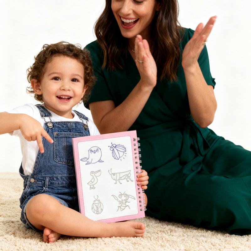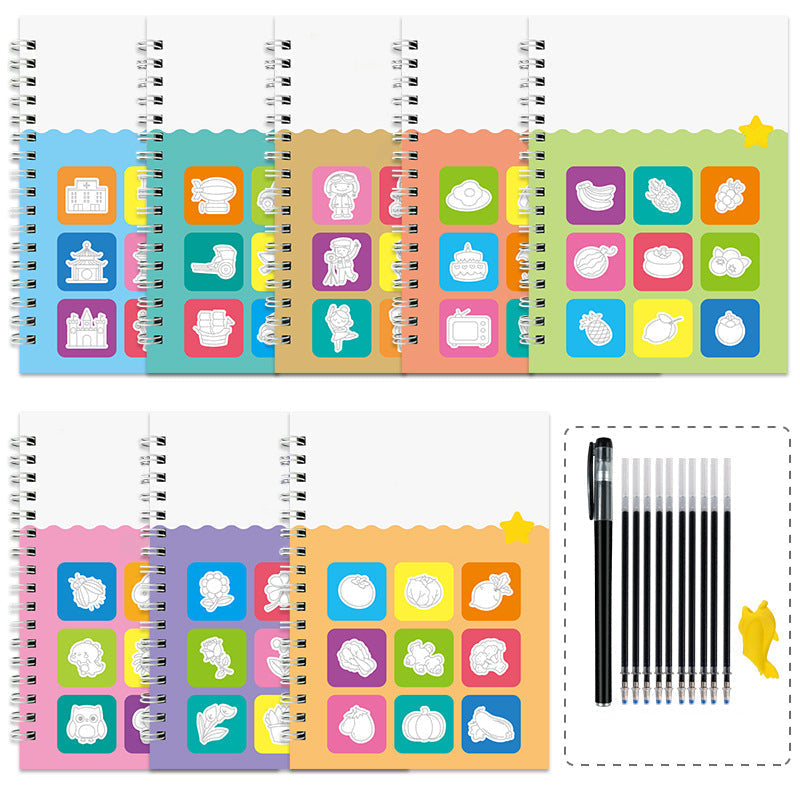 Minden könyv jól látható, előre kialakított vájatokkal rendelkezik, amelyek stabilan vezetik a tollat. Segít a gyerekeknek már korán megtanulni a pontos vonalvezetést, miközben játékosan fejleszti a finommotorikus készségeket.