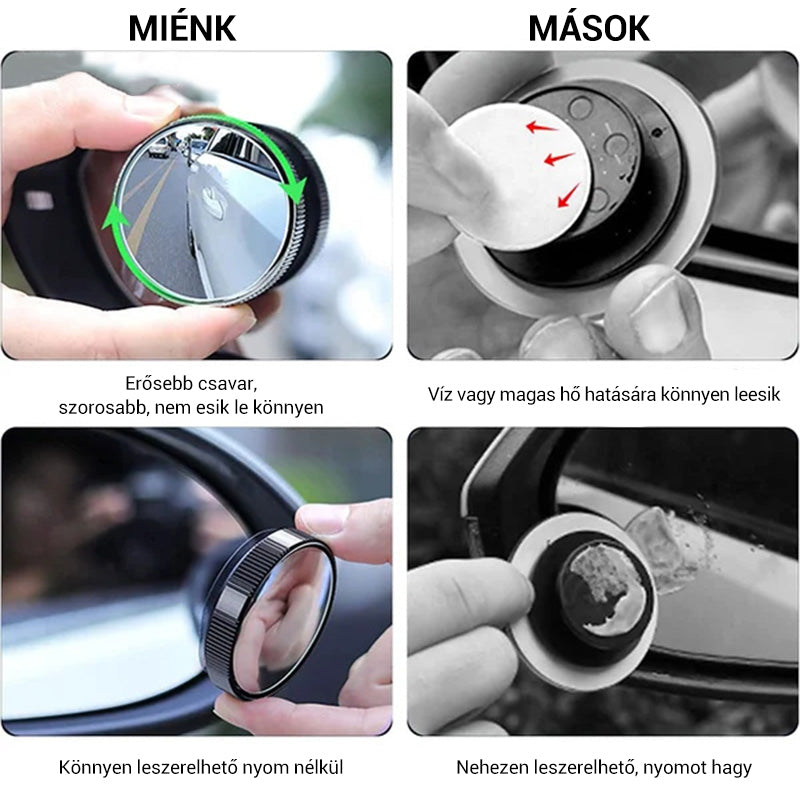 • TovĂĄbbfejlesztett kialakĂ­tĂĄs: A holttĂ©r tĂŒkör forgĂł kerettel rendelkezik, amelyhez a biokompatibilis polip tapadĂłkorong kialakĂ­tĂĄs illeszkedik, amely nagyon kĂ©nyelmesen felszerelhetƑ Ă©s eltĂĄvolĂ­thatĂł, nem kĂĄrosĂ­tja az autĂł visszapillantĂł tĂŒkrĂ©t Ă©s Ășjra felhasznĂĄlhatĂł. Az AF tĂŒkör vĂ­zĂĄllĂł Ă©s tisztĂĄn tartja a tĂŒkröt.