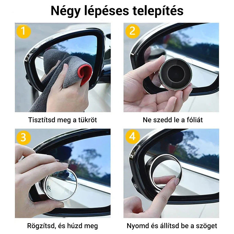 • EgyszerƱ telepĂ­tĂ©s: TisztĂ­tsa meg autĂłja eredeti visszapillantĂł tĂŒkrĂ©t, ne tĂ©pje le a hĂĄtlap fĂłliĂĄjĂĄt, Ă©s ragassza közvetlenĂŒl a tĂŒkör bĂĄrmely pontjĂĄra. Az ĂłramutatĂł jĂĄrĂĄsĂĄval megegyezƑ irĂĄnyba csavarozza be a rögzĂ­tĂ©st.