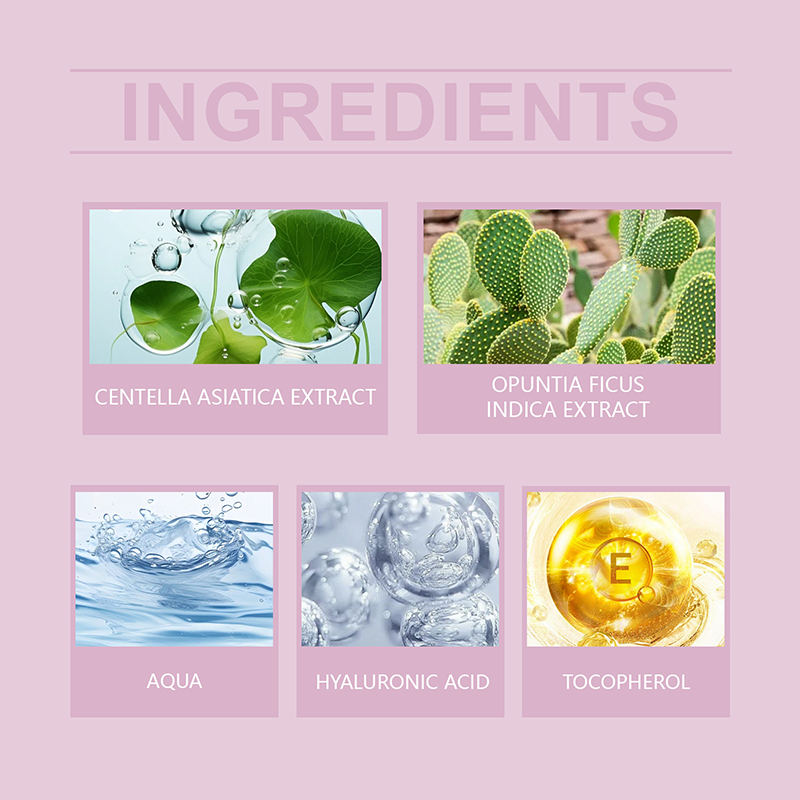 Összetevők: Centella Asiatica kivonat, kaktusz kivonat, hialuronsav, tokoferol (E-vitamin), víz.