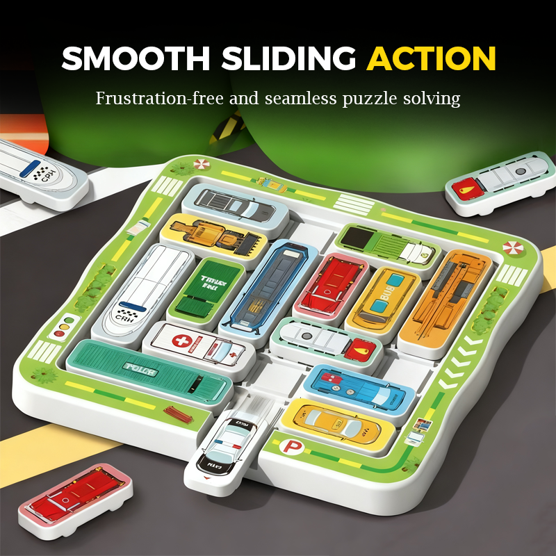 SIMÁN CSÚSZKÁLÓ PÁLYÁK: Minden járműdarab úgy készült, hogy könnyedén csússzon a tábla pályáin. Ez a frusztrációmentes mechanizma zökkenőmentes és élvezetes játékélményt biztosít, lehetővé téve a gyermek számára, hogy teljes mértékben a megoldás megtalálására koncentrálhasson.