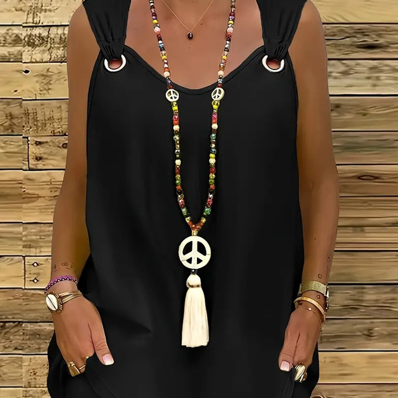 Váll nélküli ujjatlan felső: Az ujjatlan felső kifinomult V-nyakkivágással és jellegzetes, lekerekített pántokkal rendelkezik, amelyek dimenziót és modernitást kölcsönöznek.