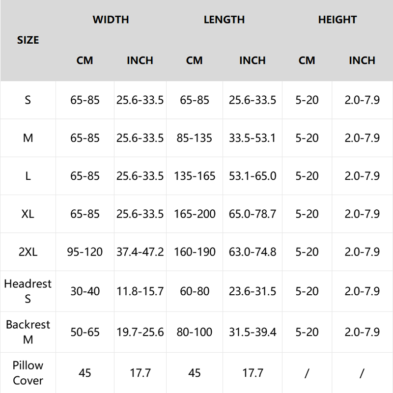 Méretek: S, M, L, XL, 2XL, Fejtámla S, Hát támla M, Párnahuzat