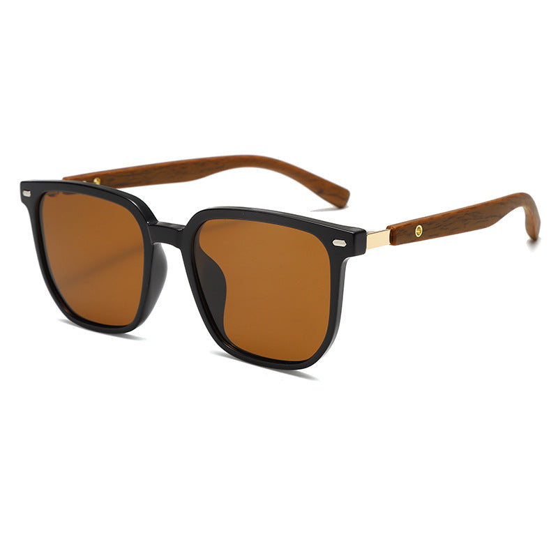 TĂ­pus: Klasszikus napszemĂŒveg szögletes fa kerettel Ă©s polarizĂĄlt lencsĂ©kkel.